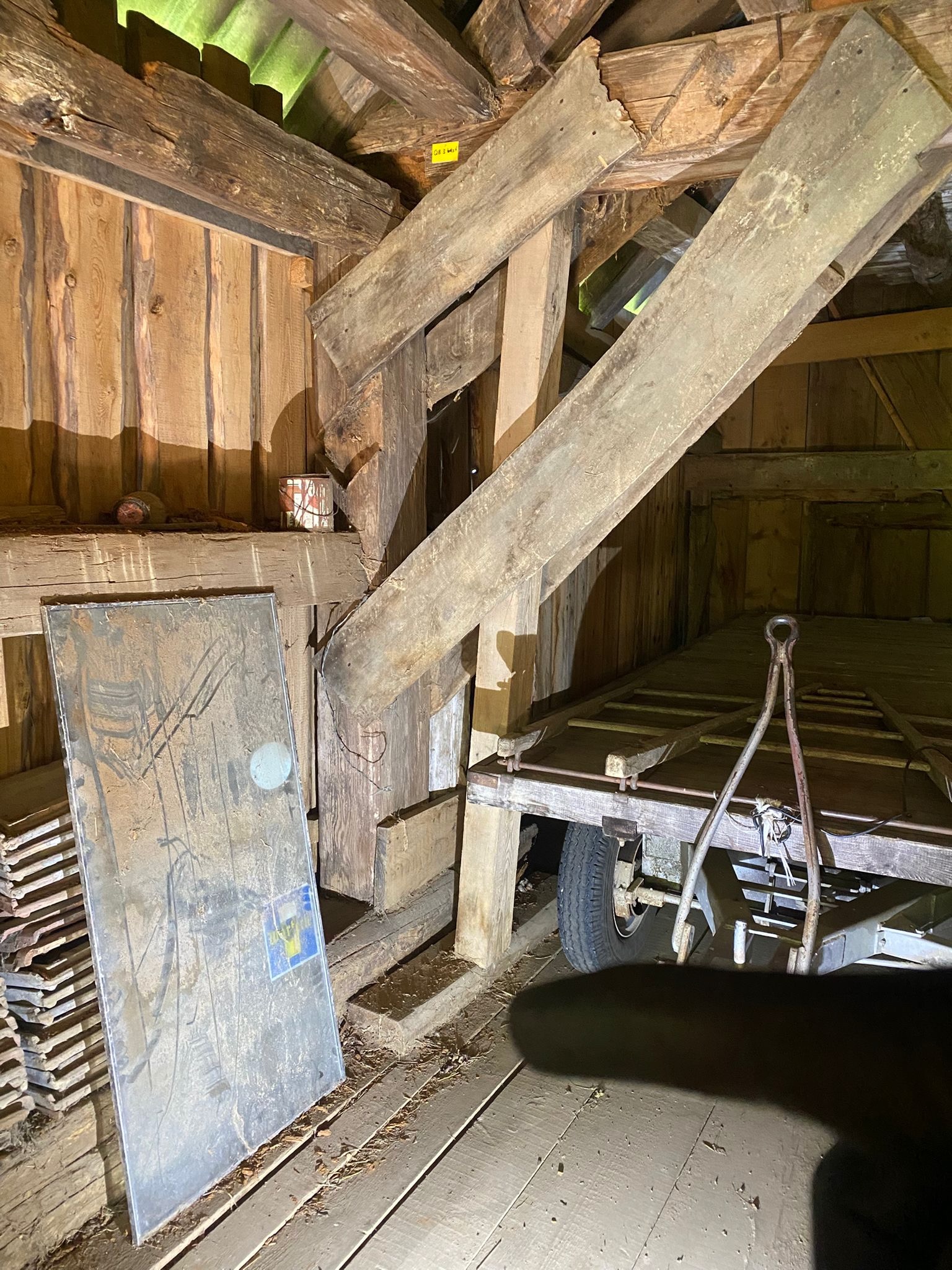 Der Innenraum der Scheune wurde ausgeräumt, die Deckenbalken wurden gesichert und ergänzt, die gelagerten Ziegel gereinigt und aussortiert. Ein provisorischer Zwischenboden wurde gelegt und die Masse des Dachstuhls wurden aufgenommen.