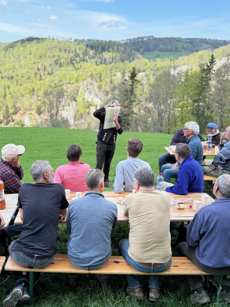 Bevor das Mittagessen serviert wurde, unternahmen die Teilnehmenden eine Wiesenwanderung von Arboldswil zum Tagungsort – fachkundig geführt von Susanne Kaufmann. Vor Ort erwartete sie eine Besichtigung der Scheune Chastelen, bei der Präsident Markus Zentner interessante Einblicke und Erläuterungen zur Geschichte und Bedeutung des Gebäudes gab.